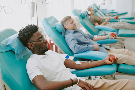 Young Black man and middle aged Caucasian man donating blood while reclining in medical chairs, holding red stress balls, intravenous tubes connected to arms, participating in blood donation process