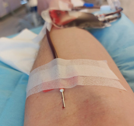 a man's arm during a blood transfusion at the hospital's emergency department only blue effect