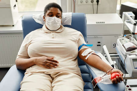 Portrait of young black woman donating blood while lying in chair and wearing mask, copy space