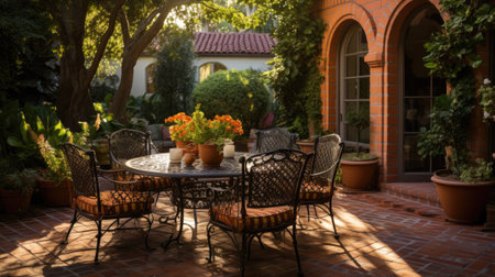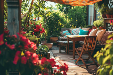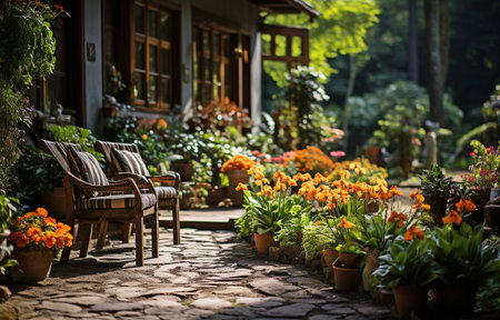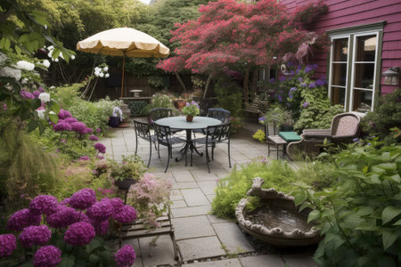 patio filled with garden and outdoor furniture, surrounded by blooming flowers, created with generative ai