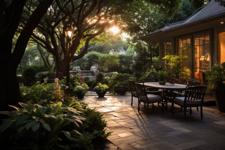 Generative AI : A back yard with a patio at sunset