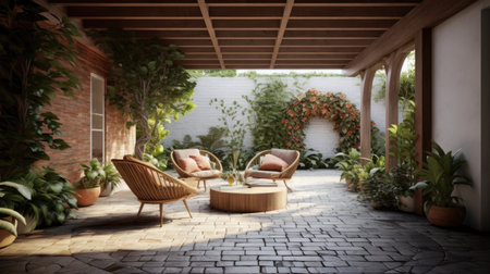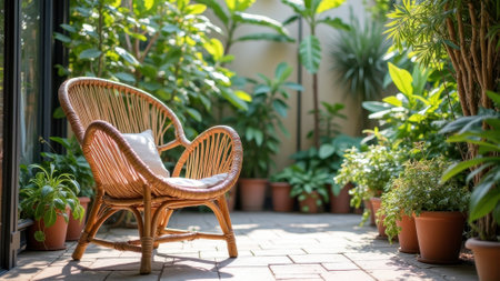 Serene patio with rattan chair surrounded by lush green potted plants. That the image is generated using AI.