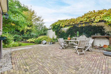 Neat paved patio with sitting area and small garden near wooden fence