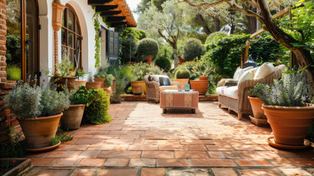A beautiful terracotta patio with comfortable seating, natural stone flooring, and potted plants creating a serene space