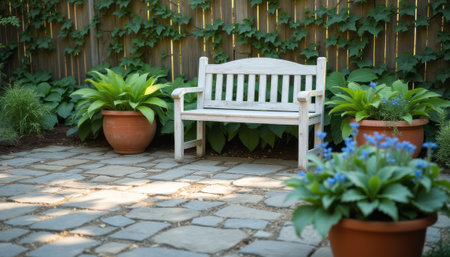 A serene garden scene features a white wooden bench nestled among vibrant green plants and terracotta pots. The tranquil atmosphere invites relaxation, with blue flowers adding a pop of color against the earthy tones of the stone patio.