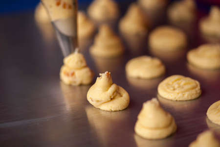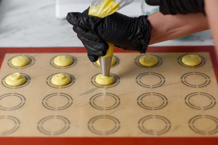 Making macaroons.The dough from the syringe is squeezed out on a baking sheet.