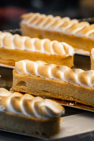 Lemon meringue pie on showcase for selling in cafe
