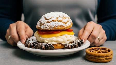 Woman holding a hamburger with cream cheese and tomato on a plate