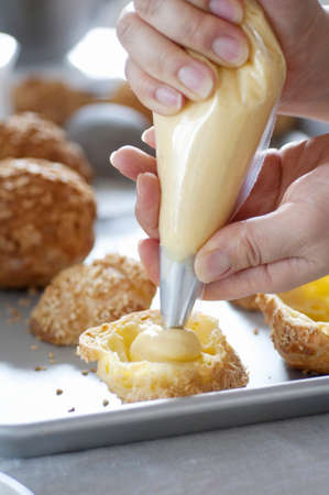 puff with cream, puff with yellow cream, sweet dessert, cake filled with cream, steamed cake, sugar puff