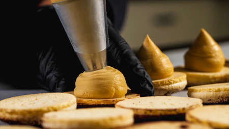 Chef is making caramel macarons, close-up.