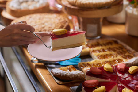 Close-up of a pastry chef cutting a large cake in portions at pastry shop.