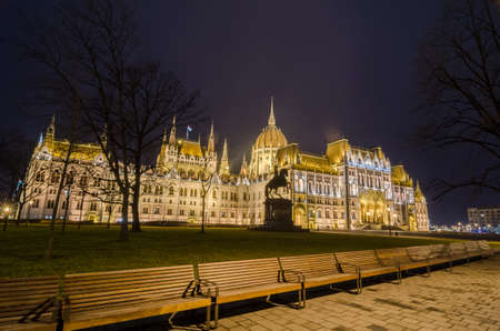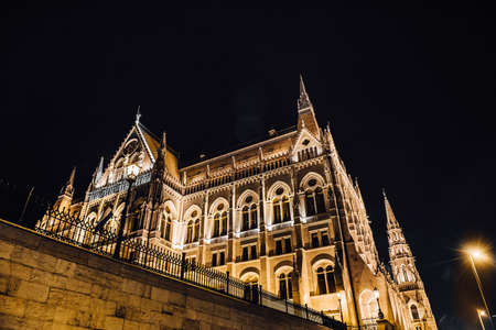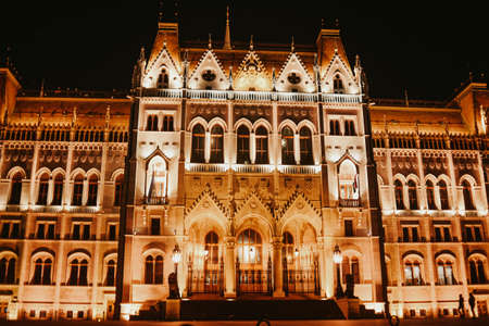 The Hungarian Parliament in Budapest on the Danube in the night lights of the street lamps