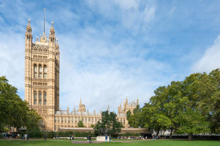 London - October 4, 2019: Palace of Westminster, aerial view, from Viktoria Tower Gardens