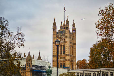 Scenic view of famous Westminster Abbey with flying plane in London, UK, on a foggy fall day