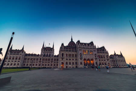The Hungarian Parliament Building on the bank of the Danube in Budapest at evening
