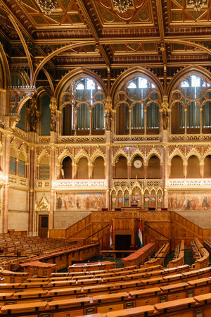 Budapest, Hungary - Feb 10, 2020: Interieur view of National Assembly Parliament golen conference room
