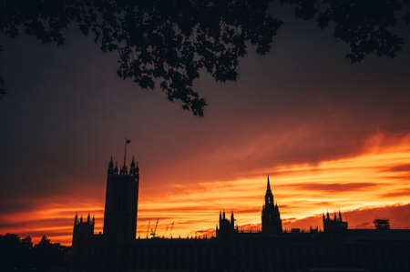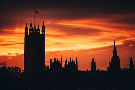 House of parliament in London, sunset sky, silhouette. Symbol of UK, Great Britain,