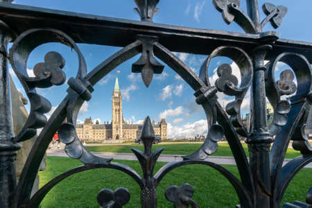 Ottawa, Canada - 09.04.2019: Wide shot of centre block of Canadian parliament building through black metal fence on a sunny day with blue sky.