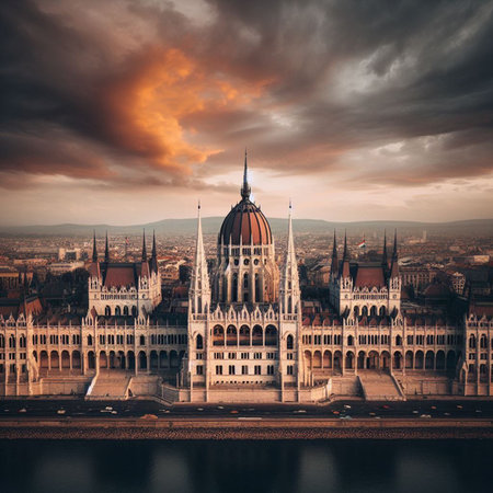 Hungarian parliament building, also known as the Parliament of Budapest, Hungary. House of the nation. Architectural theme. Cultural heritage. Red photo filter.