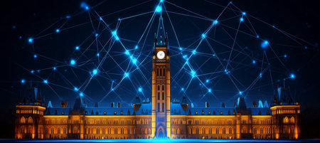 Canadian Parliament Hill in Ottawa Connected by Digital Network Visual, Technology Concept