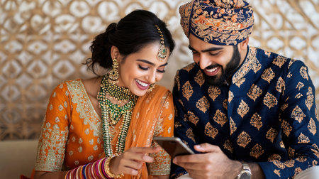 An elegant Indian couple in traditional festive clothing enjoying online shopping together on their smartphones during Diwali. A.I.