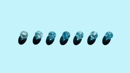 Blue glass beads on a blue background. Hard shadow and reflection. DIY handmade gift. Abstract festive composition.