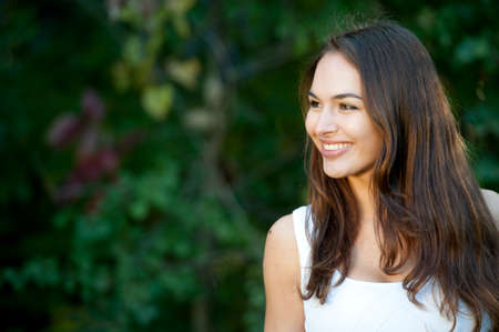 A happy young brunette girl posing outdoors with a green background on a sunny day.