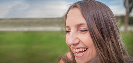 Beautiful woman laughing sincerely outside with her hair on wind.