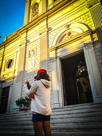 teenage girl looking at cell phone ignoring the facade of the cathedral at her side