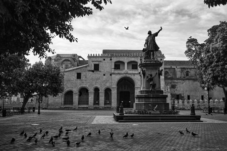 Columbus Statue and Cathedral, Parque Colon, Santo Domingo, Caribbean oldest cathedral in the Americas. Santo Domingo, Dominican Republic.