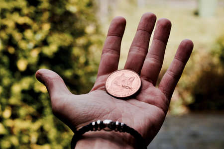 Digital currency physical brass dogecoin coin in man hand with bracelet.