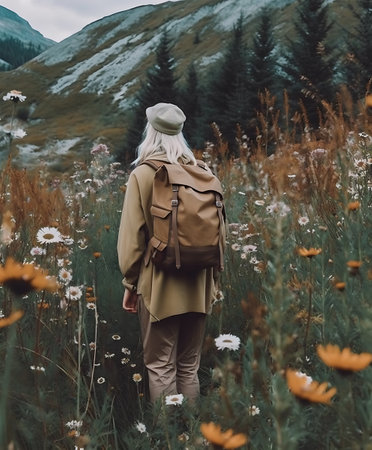 A man with a big backpack in a field against the background of high mountains. AI Generative