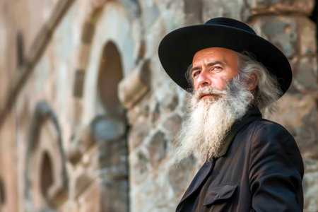 Elderly man with beard and wide-brimmed black hat stands against ancient stone architecture reflecting Jewish cultural heritage, national identity, wisdom, resilience, tradition and timeless legacy