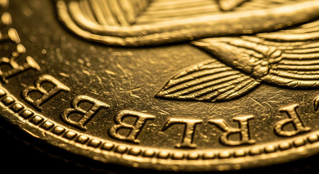 Extreme close up macro shot of a gold coin featuring the relief details of an eagle wing and lettering. The golden metallic texture emphasizes concepts of wealth finance and economic value.