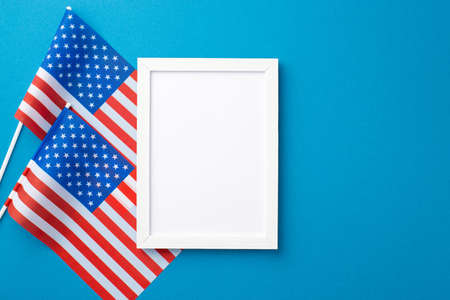 USA Independence Day concept. Top view photo of white photo frame and national flags on isolated blue background with copyspace