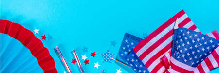 Presidents Day USA, Independence Day, US election concept. American flags and confetti stars on blue background. Flat lay, top view.