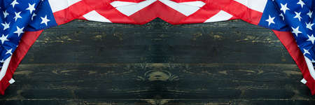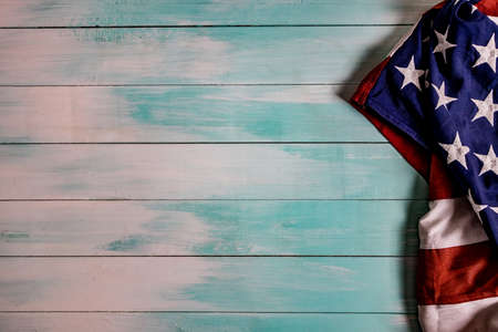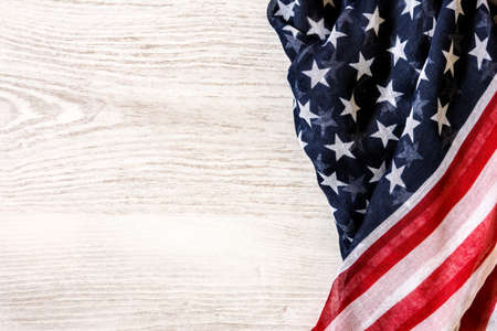 Close up of waving national usa american flag on wooden background with copy space for text.