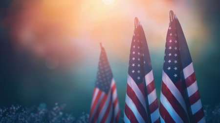Three American flags stand tall and proud against a backdrop of a hazy, colorful sunset. The flags are gently waving in the breeze, their red, white, and blue colors vibrant against the soft light. The scene evokes a sense of patriotism, pride, and hope.