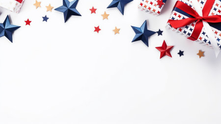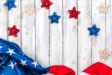 4 july independence day greeting card background with star confetti, American flags, festive decor, ribbon. USA Independence Day, American Labor day, Memorial Day, US election concept.