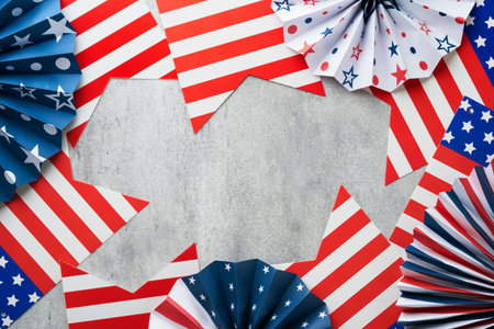 4th of July background. USA paper fans, Red, blue, white stars and confetti on gray old concrete wall background. Happy Labor Day, Independence Day, Presidents Day. american flag colors. Mock up.