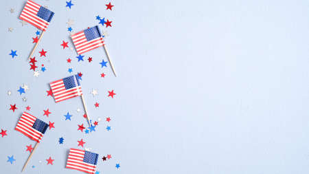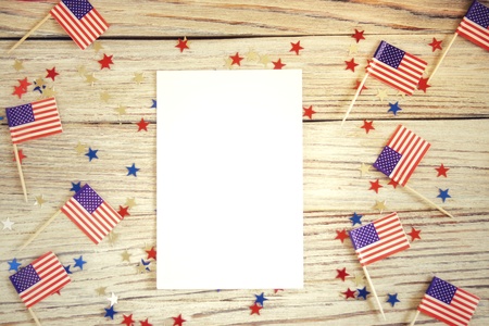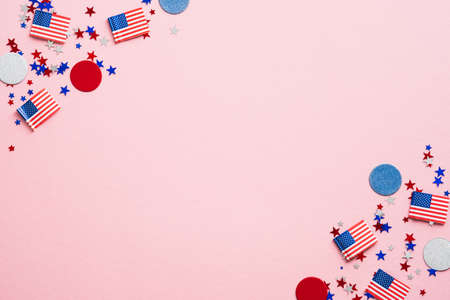Happy Independence Day 4th july mockup with mini american flag decorated with stars and confetti. Top view.
