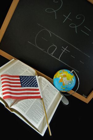 Holy Bible, flag and globe with blackboard.