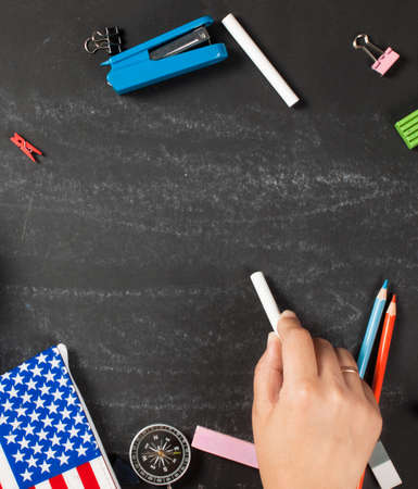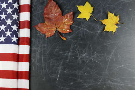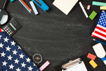 USA flag and chalkboard on color background