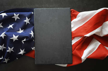 American flag on a black stone background. Space for text.