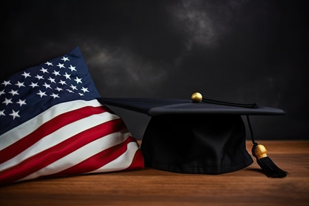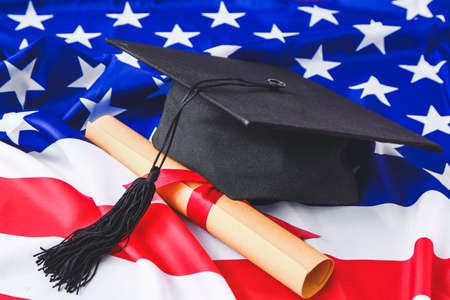 Graduation cap on the American flag. Education and graduation concept.
