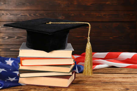 Graduation hat, books and American flag on wooden table. Space for text
