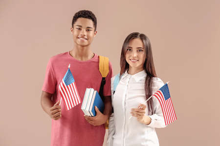 Young students with USA flags on color background