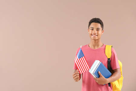 African-American student with USA flag on color background