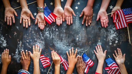 Strength in unity. Human hands and American flags, convey powerful message of strength in unity. Contemporary art. Concept of Independence Day of America, history, patriotism, 4th of July, holiday