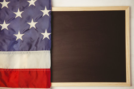 USA flag and chalkboard on wooden background